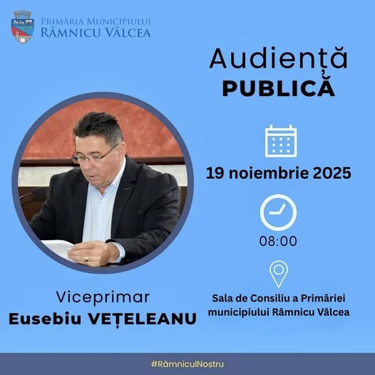Săptămâna viitoare continuă audiențele susținute de conducerea Municipalității: miercuri, 19 noiembrie, viceprimarul Eusebiu Vețeleanu va fi la dispoziţia râmnicenilor care au de rezolvat probleme ce sunt de competența administraţiei locale în cadrul unei sesiuni de audienţe programată de la ora 8:00, în Sala de Consiliu a municipiului Râmnicu Vâlcea.