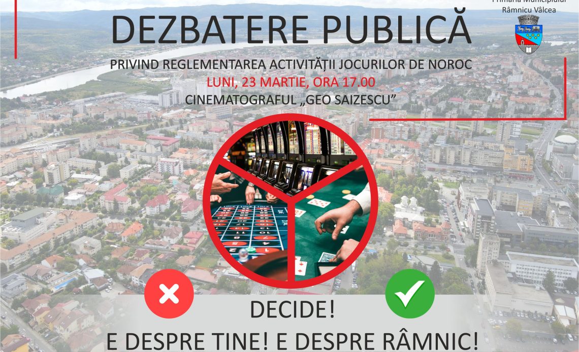 Primăria Municipiului organizează luni, 23 martie, ora 17.00, la Cinematograful „Geo Saizescu”, o dezbatere publică privind viitorul sălilor de jocuri de noroc din Râmnic