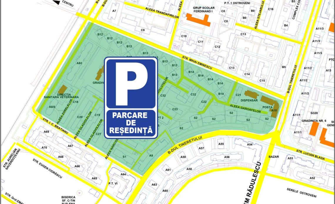 În urma întâlnirii pe care primarul Mircia Gutău a avut-o la jumătatea lunii trecute cu reprezentanții asociațiilor de proprietari din Ostroveni și ca răspuns la numeroasele solicitări făcute de participanți, în acest cartier se va institui regimul de parcare de reședință pe zona delimitată de strada Mihai Eminescu, bulevardul Tineretului, strada I.C. Brătianu și bulevardul Pandurilor. Beneficiarii celei mai mari parcări de reședință din oraș sunt locatarii a 25 de blocuri – A8/1, A8/2, C18, C19, C20, C21, C22, C23, C24, C25, C26, C27, C28, C29, C30, C31, C32, B12, B13, B14, B15, S1, S2, A9, A10 – care vor avea la dispoziție pentru parcare în baza ecusonului atât spațiile dintre aceste străzi, cât și locurile de parcare în „spic” de pe sensul dinspre est (dinspre blocuri) al bulevardului Pandurilor.
