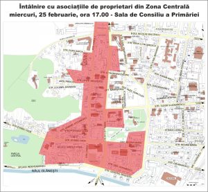 miercuri, 25 februarie, ora 17.00, în Sala de Consiliu a Primăriei Municipiului sunt invitați reprezentanții asociațiilor de proprietari ai blocurilor din zona centrală – partea de Vest cuprinsă între str. General Magheru, bd. Nicolae Bălcescu, str. Carol I, str. Gabriel Stoianovici și splaiul Independenței (conform hărții atașate);