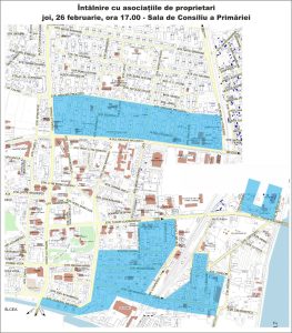 miercuri, 25 februarie, ora 17.00, în Sala de Consiliu a Primăriei Municipiului sunt invitați reprezentanții asociațiilor de proprietari ai blocurilor din zona centrală – partea de Vest cuprinsă între str. General Magheru, bd. Nicolae Bălcescu, str. Carol I, str. Gabriel Stoianovici și splaiul Independenței (conform hărții atașate);